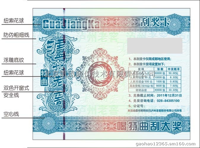 北京泸州老窖防伪刮奖卡、安全线水印纸彩虹刮刮卡印刷