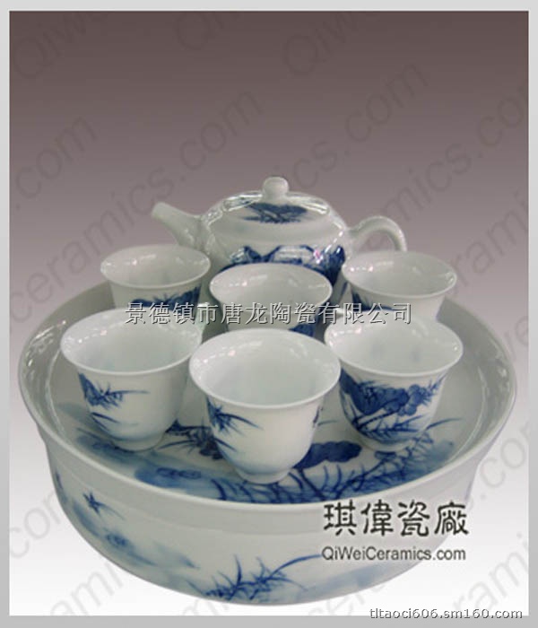我公司生产的景德镇陶瓷茶具造型优美、品种繁多、装饰丰富、风格独特。瓷质"白如玉、明如镜、薄如纸、声如磬"。有手绘青花、粉彩、玲珑、颜色釉各种样式。还可以根据您的需要印制您需要的各种图片、添加公司LOGO图形和文字等。