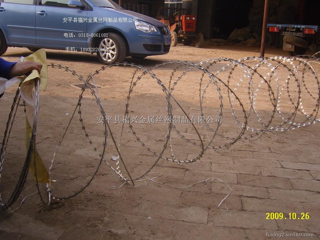 工 艺:它采用钢板(刀板)冲压成型包附于热镀锌钢丝(芯线)之上,由锐利尖角镀锌钢板或不锈钢薄板做刀片,高张力钢丝做芯线组合而成的。