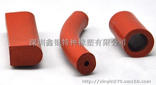 硅胶异型发泡条,没有规则的截面形状,完全按照客户的图纸、样板或配套件来开发生产。颜色主要为白色、棕红色、黑色、灰色、蓝色;硬度从10到45绍氏硬度C之间;尺寸在Φ60mm以内;密度在0.3g/cm3到0.65g/cm3之间。