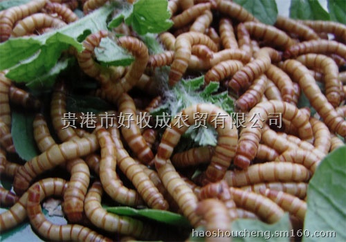 卵孵化到幼虫,化蛹前这段时间称为幼虫期,而各龄幼虫都是中国林蛙最好饲料。 成虫产卵的盘,孵化7-9天后,待虫体蜕皮体长达0.5厘米以上时,再添加麦麸子和鲜菜。每个木盘中放幼虫1公斤,密度不宜过大,防止因饲料不足,虫体活动挤压而相互咬杀,要随着幼虫的逐渐长大,及时分盘。 麦麸子是幼虫的主要饲料,同时也是栖身之地。因此饲料要保持自然温度。在正常情况下,当温度较高时,幼虫多在饲料表层活动,温度较低时,则钻进下层栖身。木盘中饲料的厚度在5厘米以内,当饲料逐渐减少时,再用筛子筛掉虫粪,添加新饲料。1-2龄幼虫筛粪,要选用60目筛网,防止幼虫从筛孔漏掉。要先准备好盛放新饲料的木盘,边筛边将筛好的净幼虫放入木盘上架。 黄粉虫幼虫生长要突破外皮(脱皮),经过一次次蜕皮才能长大。幼虫期要蜕7次皮,每蜕一次皮,虫体长大,幼虫长1龄。平均9天蜕一次皮。幼虫蜕皮时,表皮先从胸背缝裂开,头、胸、足部,然后腹、尾渐渐蜕出。幼虫蜕皮一般都在饲料表层,蜕皮后又钻进饲料中,刚蜕皮的幼虫是乳白色,表皮细嫩。