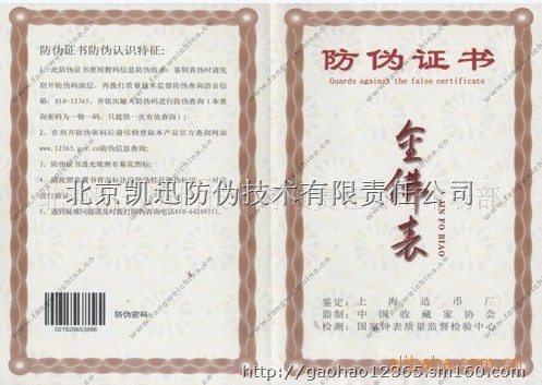 北京安全保密防伪印刷有限公司(高浩:13261838211  QQ1025694647)是一家综合性集团公司,公司有多台海德堡4色、6色印刷机,凹版印刷机、凸版防伪印刷机、激光定位冷烫机,防伪彩虹防伪印刷机。是北京具有影响力的防伪印刷基地,公司通过了ISO9002国际认证,并具有全国工业产品生产许可证、中央政府定点采购单位、中国防伪协会理事会会员单位等众多资质,在与中国造币总公司、中钞造纸公司、石钞造币公司多年合作,努力使公司不断向前的发展,创造出许多的高端防伪产品及防伪技术,掌握并熟练运用的很多防伪产品上。公司通过外派专业技术人员出国学习深造,逐步掌握了当前世界上安全防伪领域最新设计理念和防伪设计技术手段,借助蒙泰、方正超线、巴可等最新防伪设计软件系统,利用团花、浮雕、潜影等多种防伪技术效果将荧光油墨、镜像变色油墨、感光油墨、OVI油墨等多种特种防伪油墨采用四色+专色或凹版印刷技术直接印刷在水印防伪纸、安全线防伪纸或者防复印纸等特殊功能纸张上制作而成。