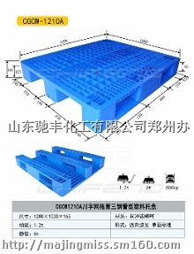 驰丰化工有限公司生产各种规格塑料托盘、垫仓板。同时开发出啤酒饮料自动流水线专用托盘和仓储物流专用货架托盘主要规格型号。型号如下: 1500*1500*150 1400*1200*150 1300*1100*150 1200*1200*150 1200*1000*150 1200*1000*160 1200*1200*170 1100*1100*155 1200*1000*165 1200*800*160 1000*800*160 1200*800*150 1200*1100*140 1200*1200*140 1200*1000*140(MM)等双面、单面、川字底、九脚底、田字底、平面、网格、网眼等规格系列托盘及垫仓板。塑料托盘与木托盘和钢托盘比较的显著优势:寿命:塑料托盘的使用寿命比木托盘长约10倍左右。质轻:塑料托盘比木托盘和钢托盘重量轻很多,便以搬运和运输。卫生:塑料托盘可随时用水清洗,美观环保性好。残值:使用过的塑料托盘仍有30%的可利用价值。塑料托盘正逐步被各行各业所认可并采用,是当今仓储物流设备中的主力军公司本着“以产品质量和顾客满意求生存、求发展、求效益”的宗旨,在激烈的市场竞争中,不断创新,不断发展壮大,已经充分赢得了广大客户的信赖。欢迎广大国内外客商前来洽谈,合作投资。