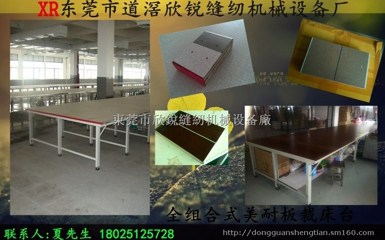 东莞市欣锐制衣设备有限公司专业生产组合式美耐板裁床及各制衣厂配套设备,本厂的组合式裁床适合国内外各种品牌全自动拉布机使用(如欧西玛,日本川上,PGM,伊士曼,NCA等);亦可配合国内外各种品牌自动裁剪机使用(格柏,力克,高鸟,和鹰,组纳,艾斯特奔马等); 规格有1530、1830、2130、2330、2430、2590、3030、3330mm全组合式耐用.耐磨.拆装方便,亦可定做,另有专业的组合式货架.查衣台,松布架,裁片架及车间各类设备。公司产都为自产自销,价格均为出厂价,欢迎来电咨询。 详情请登陆本公司网站或电话咨询.18025125728夏先生