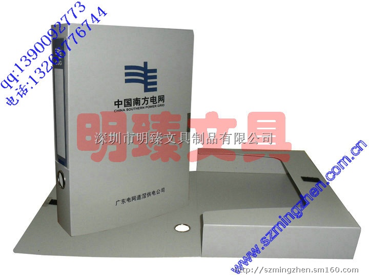 材质:档案盒采用优质环保耐用PP原材料生产,在档案盒封面及背宽处丝印南方电网LOGO及名称。在档案盒书背处电压一透明标签袋,配指环孔,背条纸。功能:用于企业宣传,同时用于公司内部办公文件的存档及管理。