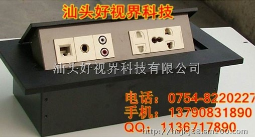 多媒体信息桌插多媒体信息桌插是一款可藏升降式计算机、电源、视频、音频及网络接口等的接插连接器,桌面信息插座很容易的安装在任何台面内,可巧妙的融入周围环境。这种坚固可靠的接线盒结构非常紧凑,使安装时间盒工作量降到了最低。桌面信息安装后可与台面保持齐平,插座连接口不容易察觉。使用时用户按下接线盒的顶部,接线盒将缓慢的开启,连接器插口便会呈现出来。可配合高档的会议桌、班台使用;所含信息模块可根据客户要求安装,安装后美观、大方、实用。