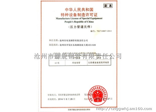 已通过ISO90012000国际质量体系认证,特种设备制造AB级压力管道元件制造许可认证,美国石油协会API 5L 认证以及其取得了多项荣誉证书。螺旋钢管厂现有四条螺旋埋弧焊管生产线,全部采用当今先进的生产设备及美国林肯自动埋弧焊机,并配备了在线数字超声波探伤仪、静水压试验机、射线实时成像、万能材料实验机、夏比材料冲击实验机等完备的质检仪器。公司产品经中国石油工业专用管材质量监督检验中心检验,全部达标。