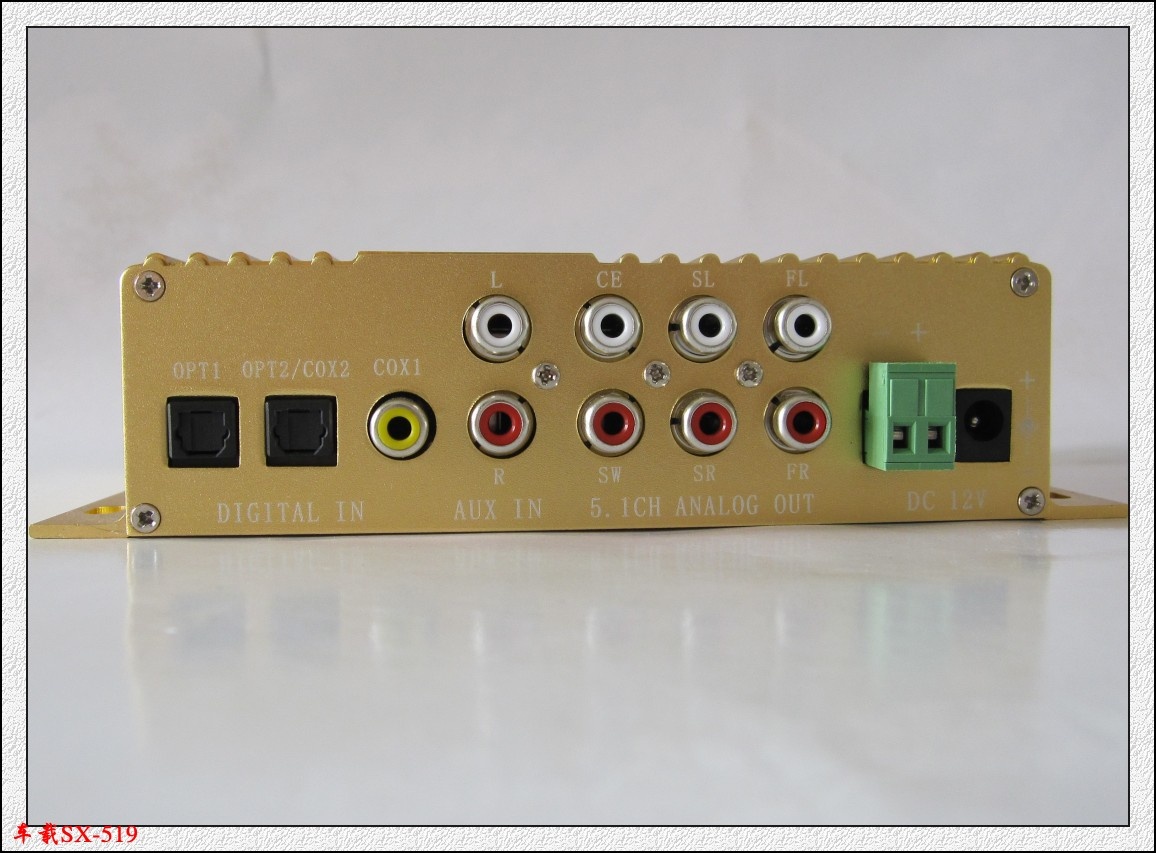 感谢你使用SX-519黄金版5.1声道数字音频解码器。该解码器对播放设备输出的数字源码音频信号进行解码,还原到DTS/AC-3杜比声场,接5.1功放、音响和立体2.1音响。让众多家庭、学校、广场、音乐厅、KTV、电影院、车载等场所享受DTS/AC-3杜比声场带来的震憾效果。本产品双光纤,单同轴,单立体声输入不仅可以解决DTS,杜比AC-3解码的问题,还能实现多个播放器共享一套音响设备,物超所值,满足你的发烧享受之音