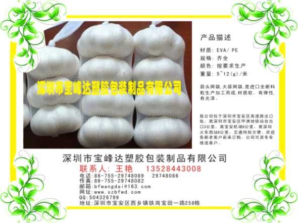 深圳市宝峰达塑胶包装制品有限公司,专业生产各种挤出塑料网袋,一般原材料为:PP / PE / PO,生产范围:10目~280目网孔,宽度:5cm~300cm。主要产品:玩具网袋,工艺品网袋,化妆品网袋,水果网袋,香皂网袋,双层网袋,过滤网袋,樟脑球网袋,环保网袋,包装网袋,蒜头网袋,干果网袋,农产品网袋,洗面泡泡网袋,购物网袋,沐浴花,沐浴巾,公仔沐浴球。网扣:(大,中,小号)。
