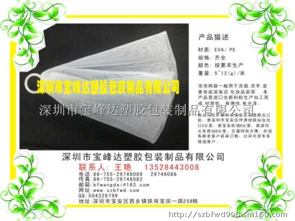 深圳市宝峰达塑胶包装制品有限公司,专业生产各种挤出塑料网袋,一般原材料为:PP / PE / PO,生产范围:10目~280目网孔,宽度:5cm~300cm。主要产品:玩具网袋,工艺品网袋,化妆品网袋,水果网袋,香皂网袋,双层网袋,过滤网袋,樟脑球网袋,环保网袋,包装网袋,蒜头网袋,干果网袋,农产品网袋,洗面泡泡网袋,购物网袋,沐浴花,沐浴巾,公仔沐浴球。网扣:(大,中,小号)。
