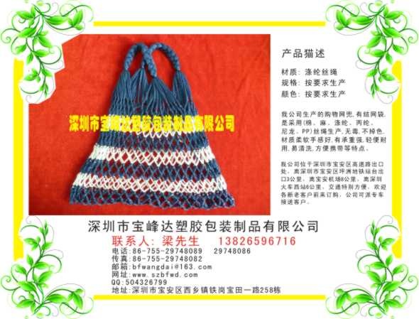 深圳市宝峰达塑胶包装制品有限公司,专业生产各种传统手工艺编织网袋,拥有熟练工人100多人,为了确保大批量订单不造成延误工期的问题!我公司还在沿海一带如:海丰、汕头、惠州等地设有多个加工机地,解决人力资源短缺问题,所有工人都会织各种类型的网袋、渔网,有一流的织网技术,有能力短期内完成大批量订单,由于我公司的多个加工地点都是农村,这也解决了降低成本和就业的问题。