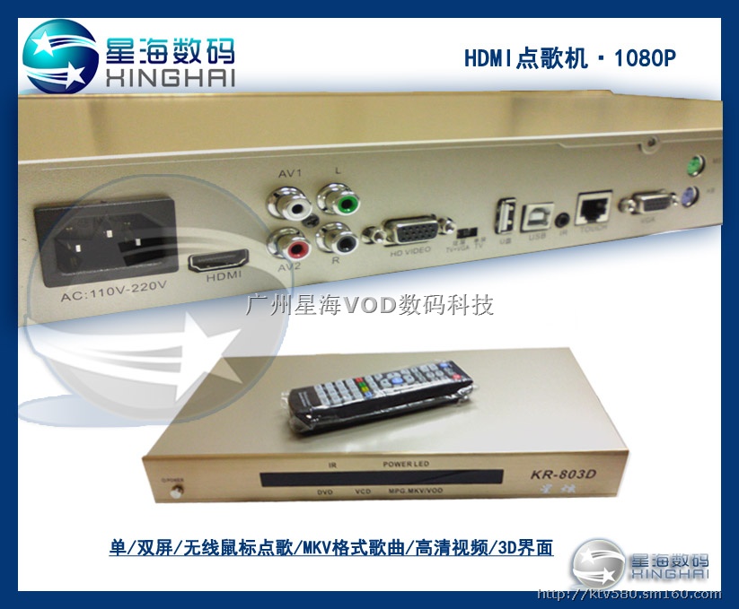 真实1080P高清播放,全球首款支持无线鼠标点歌,超强的音效矫正功能,在触摸屏上完成加歌。