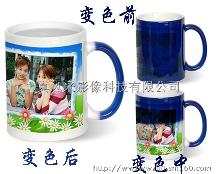 变色杯,就是会变色的杯子,又别称魔术杯。,就是杯子原先表面是黑色(或者其他颜色),如果接触到热量之后就会慢慢的从黑色转变为白色(杯子本身的颜色),那么印在杯子表面的图案也就自然而然的显示出来,当杯子里的水凉了之后,它又恢复回原来的颜色,印在杯子上的图案又重新被杯子表面的颜色“掩埋”了起来。 变色杯是可以自己定制的,是一种个性礼品。只要是电脑上的一切图片,相片,文字,LOGO等,都可以随心所欲印在杯子上。 各种场合都适用,体面又不贵,是送礼的首选!