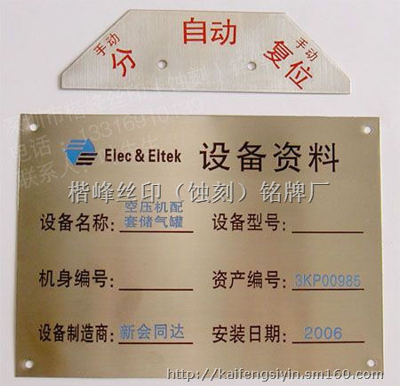 、不锈钢、铜来制作、可腐蚀字和腐蚀底色、做出来的效果可分字凸起来,和字凹下等效果,质优价廉,欢迎订购!