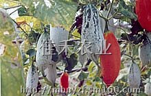 变色瓜根系特别发达,蔓长6~8米,生长势特别旺盛,叶深绿色,两面密生茸毛,掌状,叶脉放射状。 雌雄同株异花,因此结瓜率特强,瓜型奇特,两头尖中段粗,瓜皮以白绿为主,间有绿色细条纹,果肉白色,单果重200~300克,嫩瓜食用味道好,炒菜或做汤,口味清香。留种成熟的种瓜色彩红艳,经久不落,非常美丽。 变色瓜产量奇高,单株可结果200~300个,种上2~3株全家食之不尽,结果期长达4~5个月。 变色瓜适应性强,对光照要求不严,耐高温,耐干旱,中国南北均可种植,每年2~6月均可播种,对土壤适应性很广,但以排水良好的沙壤土或粘壤土为宜。需搭高架棚种植,亩栽300株,亩产万斤以上。