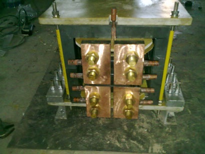 中频变压器结构特征:淬火变压器由壳式结构铁芯组成,采用δ=0.35mm高矽矽钢片叠装而成。铁芯线圈均有水冷措施,线圈采用交叠式。