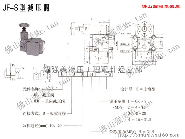 JF:减单阀,JDF:单向减压阀,B:板式连接,通径:10、20,H:公称压力31.5Mpa,调压范围:1:0.6~8,2:4~16,3:8~20,4:16~31.5。S:上海型。
