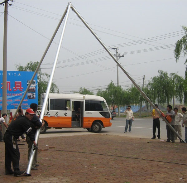 1、支起铝合金三角架立杆机,中间垂直点正对挖好的线杆坑 2、用油丝套住铝合金立杆机线杆,套在线杆的4.5米处(10米线杆) ;5.3米处(12米杆) ;5.5米处(15米杆) 3、人工摇动铝合金立杆机稳机手柄,把线杆粗头朝下,垂直吊起地面后,线杆随立杆角度惯性,自然放入坑内 4、两棵辅杆(12米-15米)支起后,必须平行和主杆成为等腰三角形.两棵辅杆支撑点*不能超过3.5-4米.