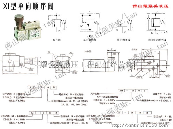 XI:单向顺序阀,XIy:液动单向顺序阀,B:2.5Mpa,无标记:6.3Mpa,公称流量:10(中压无)、25、63,B:板式连接,无标记:螺纹连接。