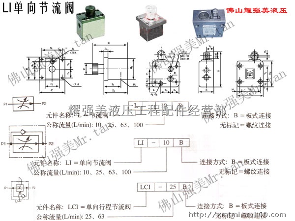 L:节流阀,LI:单向节流阀,LCI:单向行程节流阀,公称流量(L/min):10、25、63、100,B:板式连接,无标记:螺纹连接。
