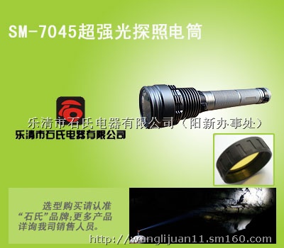 SM-7045氙气强光手电筒,超强光手电筒,HID强光手电筒目前世界上最亮的手电筒之一,广泛适用于各类企事业单位夜间处理各种突发事件、工程设备抢修、工矿勘探作业、渔船海上作业、轮船的货柜及船舱作业、铁路作业、夜间野外紧急抢修作业等,尤其适合于军警夜间巡逻以及在黑暗中需要高清晰照明场所。