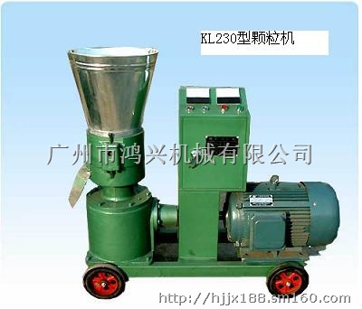 广州鸿兴机械设计的KL系列平磨颗粒饲料机,将已混粉状饲料经挤压一次成型,为圆柱型颗粒饲料, 原料干进干出,在造粒过程中不需要加水,无需烘干, 自然升温达70℃-80℃左右可使淀粉糊化蛋白质凝固变性,颗粒内部熟化深透、表面光滑、硬实、长短可以调、成型率100%,颗粒不易霉烂、变质,可长期贮存,提高了畜的适口性消化吸收功能,缩短畜禽的育肥期,有效保证广大养殖户的生产成本. 适于加工猪、牛、羊、鸡、鸭、鹅、兔、鱼禽畜水产等饲料颗粒加工。是养殖专业户及中小型饲料加工厂降低成本提高经济效益的理想设备。                                                                     该机加工颗粒饲料具有很多优点