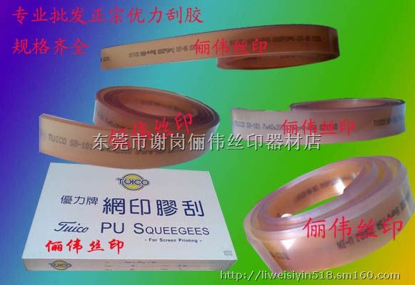 1、白色平刮系列SB(119):用于平面制图或纺织印刷最广泛的刮刀。抗磨损,耐溶剂,寿命长,适用于各类油墨。 2、咖啡色平刮系列SB(101):用于平面制图或纺织印刷量广泛的刮刀。抗磨损,耐溶剂的性能佳,寿命长并适用于各类油墨上。 3、白色斜尖刮系列SB(219)。 5、白色尖头刮胶系列SB(319):控制油墨下墨量最佳,符合圆形筒状物或是细致文字印刷之要求。 6、咖啡色斜平刮胶系列SB(401):用于控制印刷角度较理想,允许在大多数承印物,对粗糙或细密油墨可大幅度控制印刷角。 7、白色斜平刮胶系列SB(419)。 8、圆刮: 用于控制印刷角度极为理想,在多数承印体上,对油墨印出量特厚时控制极为理想。