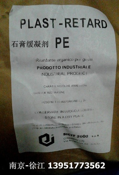 Plast Retard PE是由意大利SICIT 2000公司生产的石膏缓凝剂,呈象牙白粉末,约100%的活性成份。缓凝效果比柠檬酸及其他国产同类缓凝剂高10倍以上。 该公司产品主要用于粉刷石膏,石膏陶瓷模具,石膏板,石膏填缝料,石膏黏结砂浆,石膏砌块,机器喷涂石膏腻子等。