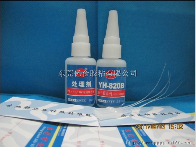 使用方法:1、使用绵布或砂纸将接着面的灰尘、油污、铁锈等除去,再以******或三氯乙烯等清洗剂擦拭,以清洁接着表面,再取适量处理剂涂于要粘接的PP/PE/POM表面一至两分钟左右,让表面处理剂挥发后。2、拧开820B胶水的前盖,即可使用;瓶口太大,瓶口如有胶水先用绵布将胶水擦拭干净,再可套上针头或PE滴管后使用,得以控制胶水流量,保证使用的效果。