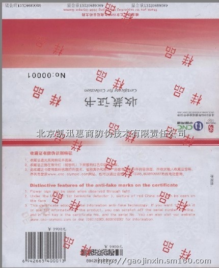 主要防伪纸张有:水印纸、安全线纸、证券纸、纤维纸等多种纸张;在设计上主要采用方正超线防伪设计软件设计团花、花边、底纹、潜影、微缩、浮雕等多种形式防伪图案,不仅可以提升证书的美观度还能提升证书的自身价值和企业的相关信息。在印刷上主要采用专色、四色印刷等形式保障证书的整体设计效果北京凯迅惠商防伪技术有限责任公司为了客户需要,用数码防伪技术与产品的流向监控相结合的技术,对生产、库存、销售环节的物流信息进行管理控制,从而实现对全系统物流分布、库存以及销售情况等信息的及时获取,企业市场稽查人员通过核对物流码、并对潜在窜货编码进行人工输入、手机或通过网络查询窜货,能有效解决产品窜货问题。 凯迅防伪正是响应客户需要,用数码防伪技术与产品的流向监控相结合的技术,对生产、库存、销售环节的物流信息进行管理控制,从而实现对全系统物流分布、库存以及销售情况等信息的及时获取,企业市场稽查人员通过核对物流码、并对潜在窜货编码进行人工输入、手机或通过网络查询窜货,能有效解决产品窜货问题。
