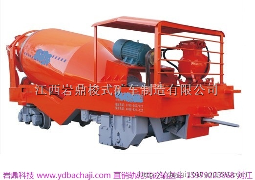 轨行式砼搅拌运输车最大的特点就是解决了混凝土输送泵(托泵)的远距离,特别是在大坡度斜井输送混凝土时出现水与混合料离析的问题,使锚杆支护与转子式混凝土喷射机结合锚喷支护的质量稳定坚固。以及解决了在含瓦斯等危险气体的隧洞井巷施工。