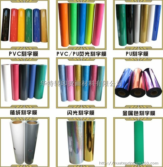 热转印刻字膜;PVC刻字膜/PU刻字膜/植绒(CDF)刻字膜/镭射(CDH)刻字膜/闪光(CDG)刻字膜/夜光刻字膜/反光及PU(CDU),PVC可打印刻字膜;规格50CM*25M
