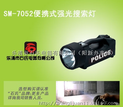 SM-7052充电式强光搜索灯,军用强光搜索灯,远距离强光搜索灯是石氏电器有限公司设计制造的高性能抗震防水强光搜索灯,超白光射程可达3000米,品质超群,科技含量高,是当前照明光源产品中唯一具备全天候工作环境的便携式高亮度强光照明产品;外型采用高强度铝合金材料制造,造型美观、流畅、结构坚固、合理,同时具有良好的防水性能,可靠的高温保护装置,操作简单。