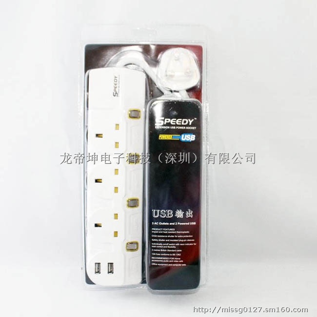 香港speedy英规多功能插座SCE-001,三个AC英规插口为您的冰箱、空调、洗衣机、电视、微波炉、电磁炉、风扇等交流电电器供电,同时配置2个1000毫安USB电流输出接口,可用USB充电线连接到手机、ipad、iphone、ipod、MP3、MP4、PSP等其它数码产品充电。