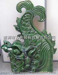 我公司生产仿古建筑使用的各种琉璃瓦件:板瓦(底瓦)、筒瓦(盖瓦)、勾头(猫头)、滴水(流水)、脊瓦、挡勾等,其他装饰配件有吻兽(鱼尾吻、正吻、卷尾吻)、垂兽(背兽、套兽、鱼尾兽)、走兽(龙、凤、麒麟、狮)、挑角(凤头、卷草)、宝顶及屋顶装饰品:龙凤呈祥、二龙戏珠等。