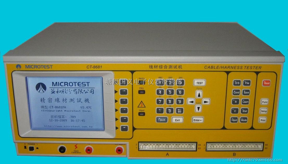 CT-8681精密線材測試機產品型號:CT-8681.最高1000Vdc/500Vac 測試.自動掃描找點.單邊線材測試.瞬間短段路測試.大型 320x240 LCD 顯示.可程式化測試設定.統計及列印功能现货批发CT-8681N/CT-8681F/CT-8681FA 常备现货、批发电议