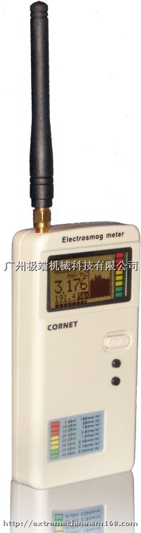 ED-85EX数字式高频电磁辐射检测仪是美国CORNET Microsystems公司研发设计的一款用于高频领域电磁波辐射强度检测的专业仪器. 它具有操作简单、灵敏度高、检测结果准确、可外接天线的特点, ED-85EX可检测的范围极宽,能准确的对1MHz ~8GHz范围内的射频、微波、无线信号等电磁波进行准确的测量,同时可显示当前信号的频谱分析图。ED-85EX具备标准的SMA外接端口,因此,您还可以外接更高规格的天线、探头等,这样能有效提高ED-85EX的检测范围和检测精度。因此,ED-85EX特别适合公司,个人居家环境等多种环境下快速对电磁波辐射强度安全测量评估, 例如手机基地台附近电磁波辐射强度微波炉泄漏辐射电场强度,无线网路WiFi测试等。 是您对抗电磁波辐射污染的最佳工具。