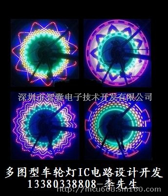 “风火轮”是最新研发的汽车动态闪光装饰品,由光控电路、动态感应电路、发光电路组成,独立电路设计,无需改动或连接汽车本身电路,装于爱车车轮的气门嘴上,有闪灯,白天或停车时不闪光。我公司提供控制板及IC,根据客户要求开发各种颜色,图型,文字,数字,时间等。