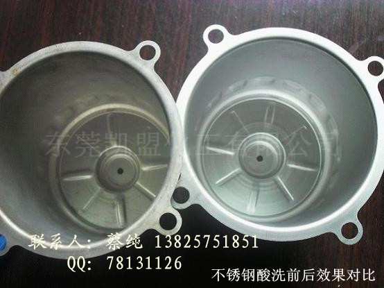 | 凯盟牌不锈钢酸洗钝化液 型号:ID4008 钝化机理:“凯盟不锈钢酸洗钝化液”由多种高效络合剂、缓蚀剂、酸洗剂等组成。区别与一般的防锈油或封闭剂。不锈钢表面经过与钝化液浸泡接触后,在不锈钢表面产生微化学反应,在清洗和统一转变工件表面颜色的同时,将原先化学性质活泼的金属表面转变为化学性质惰性的金属表面,达到很难以与外界物质再产生化学反应。从而达到长期防锈的作用。 作用:“凯盟牌不锈钢酸洗钝化液”可以将不锈钢表面转变为统一银白色的清洁表面,同时能有效保护金属基体、延长不锈钢防锈或抗氧化的能力、至少可以提高6倍以上的防锈能力、提高耐盐雾测试时间、延长工件的使用寿命。 不锈钢酸洗钝化液的应用: ▲ 清洗不锈钢表面,统一“银白色”,提升不锈钢的防锈能力、提升不锈钢的盐雾测试能力、提升产品附加值。 ▲ 适用于经过焊接处理,需要清除焊斑并统一颜色的产品。 ▲ 适用于经过热处理、需要清除氧化皮及统一颜色的产品。 ▲ 适用于压铸不锈钢,清除表面杂物,并统一颜色的产品。 ▲ 适用于有需要亚光、以及修饰产品轻微伤痕的产品。 ▲ 适用于已生锈或氧化后需要恢复不锈钢本色并起到保护作用的产品。 适应材料:适用于所有300系列不锈钢(301、302、304、305、309、310、316、317、321、347、XM7、XM15J1……) 不锈钢酸洗钝化液产品强大优势: ▲ 、酸洗与钝化功能二合一,除污、除锈、除焊斑、并同时起来保护作用。 ▲ 、处理后的产品颜色统一,外观一致。统一“银白色” ▲ 、使用成本低廉、药液可重复使用、效率高、是替代机械打磨或除锈的最佳方法。 ▲ 、钝化后抗腐蚀能力强。 ▲ 、操作简单、只需常温浸泡、不需特定设备。 ▲ 、安全环保、操作环境友好。 ▲ 、不影响材料导电性能、不改变材质成份、不影响喷涂等结合性。 不锈钢酸洗钝化液的使用方法: 产品清洗干净后直接浸泡“凯盟牌不锈钢酸洗钝化液”、再清洗干净即可完成。 以上是不锈钢酸洗钝化液详细信息,如果您对不锈钢酸洗钝化液的价格、厂家、型号、图片有什么疑问,请联系蔡小姐(13825751851) 或是加Q(78131126)获取不锈钢酸洗钝化液的最新信息!我们将免费为您提供试样、供样、以及相关技术支持!互利双赢是我们共同的宗旨! |