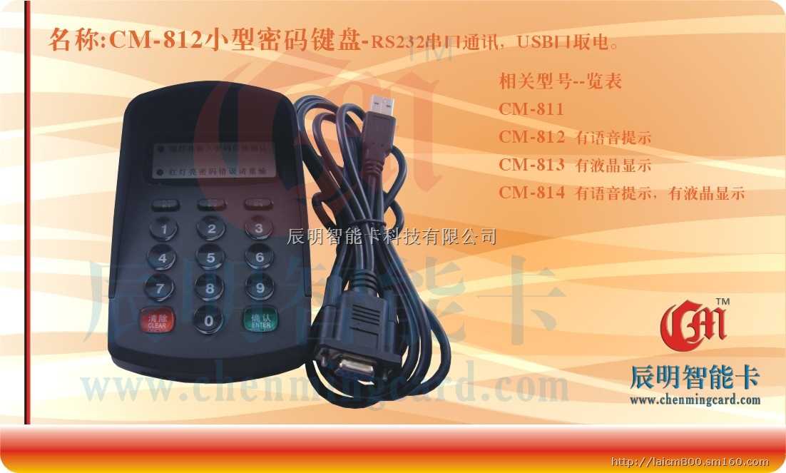 ● CM800系列小型密码键盘,以其独特的外型设计、丰富的用户接口,简明实用的命令组,广泛应用于各大专业银行、证券业、保险业、商业POS等领域,深得广大用户及金融界人士的好评。已经配套的终端型号有:IBM4704系列、长城系列、国光系列、实达系列、新大陆系列、海豚系列、DECVT系列、法国布尔EFT/POS、华诚系列、海威系列、WYSE系列化、顺华系列等终端并提供DES、LCD、LED及语音模块供用户选择。