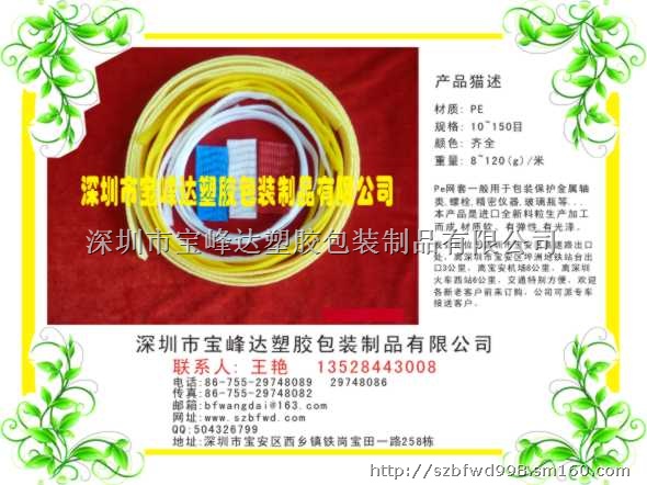 深圳市宝峰达塑胶包装制品有限公司,专业生产各种挤出塑料网套,一般原材料为:PE / EVA / PP,用于包装保护金属轴类、螺栓、精密仪器、玻璃器具等…保护外表面保护表层及边缘部分,在运输,搬运,以及储存时不会受到损伤,防止损伤外表面。主要特性有:材质软,易储存,可再利用及再循环,经济环保。适合套直径5mm-直径500mm的各种物品,从每周10个孔起,每周增加5-10网孔为一规格,目前最多一周有280个网孔,网套的每米克重、网孔的大小、都可以在生产时按要求调整。可以以任何形状来配合部件或产品的包装须要,产品种类多,规格齐全,配色精美,免费打样,产品横向收缩性好,也可按客户要求生产,开发出各行业所须的防伪产品。