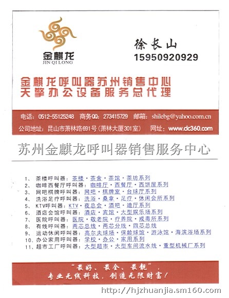 公司最新研发工厂呼叫器,用于生产车间流水线上,方便每个工位呼叫干部,机修,质检,材料,换人,取消等,接收主机上显示不同的代码且有优美的音乐伴奏,大显示屏,双面显示,被呼叫人员一目了然,也可以给被呼叫人员佩戴手表式移动呼叫器接收机。使接收信息更加明了。目前,在苏州、上海,昆山、无锡等全国近几千家工厂和服务场所都在用我们公司的金麒龙工厂无线呼叫器系统。