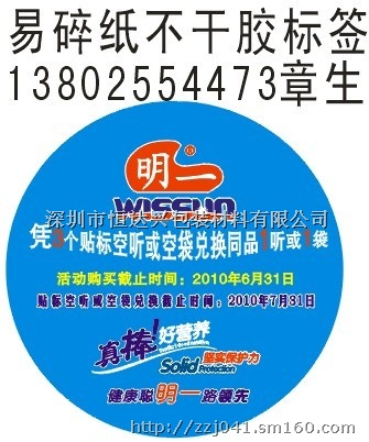 易碎纸不干胶印刷 彩色易碎纸不干胶 易碎纸不干胶标签 易碎纸不干胶标贴易碎纸特点:其表面与纸质标识表面一致,但是此类标识在被粘贴到产品上,揭开便破损,从而其标识不可能被重复使用。利用易碎纸特性,结合电码防伪技术,在易碎纸表面印上企业信息、LOGO、查询方式、喷上防伪密码,在密码区域印上刮刮墨,从而达到更好的防伪效果,这就是易碎纸电码防伪标贴。同时也广泛应用于产品封口。标一防伪可根据产品特点,设计相应方案,确保其防伪最佳效果。