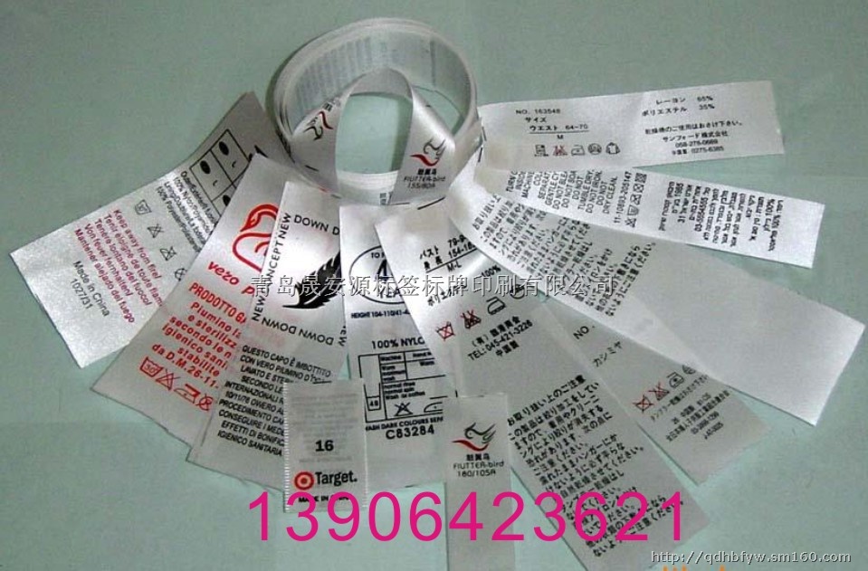 公司新引进柔印设备,主要印刷各种高档洗涤提示商标,经公证行测试,不含偶氮,铅等其他化合物,绝对环保.可通过超强50次洗涤测试,不脱色.可印制极细字体,清晰,不断线.可以各种材质如涤纶,尼龙,纯棉带,织带等上面印刷,效果完美.一般用于服装,衬衫、玩具布标、袜子等产品的洗水提示方式。欢迎广大新老客户来电洽谈