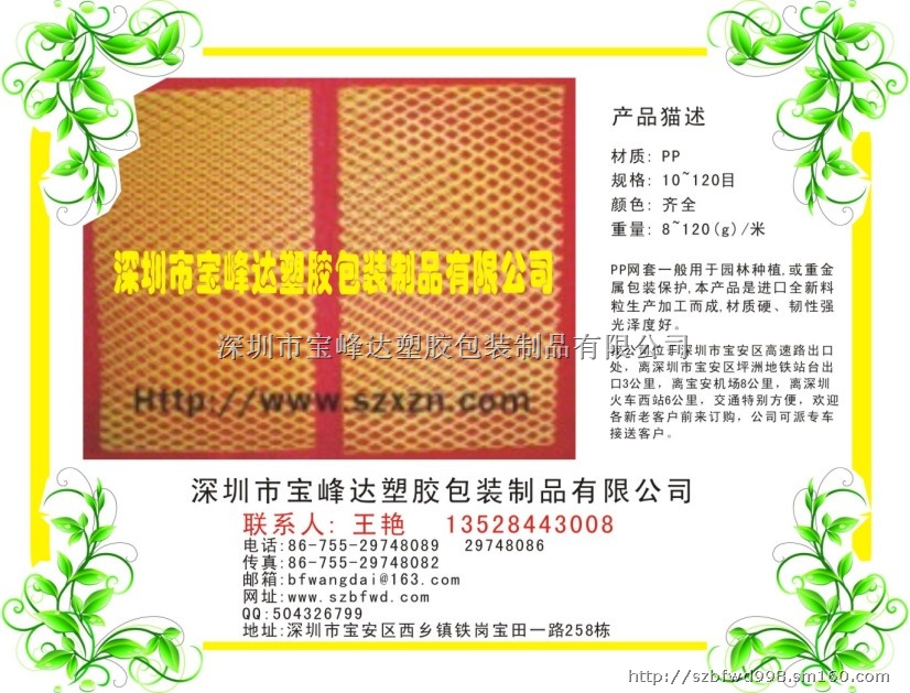 深圳市宝峰达塑胶包装制品有限公司,专业生产各种挤出塑料网套,一般原材料为:PE / EVA / PP,用于包装保护金属轴类、螺栓、精密仪器、玻璃器具等…保护外表面保护表层及边缘部分,在运输,搬运,以及储存时不会受到损伤,防止损伤外表面。主要特性有:材质软,易储存,可再利用及再循环,经济环保。适合套直径5mm-直径500mm的各种物品,从每周10个孔起,每周增加5-10网孔为一规格,目前最多一周有280个网孔,网套的每米克重、网孔的大小、都可以在生产时按要求调整。可以以任何形状来配合部件或产品的包装须要,产品种类多,规格齐全,配色精美,免费打样,产品横向收缩性好,也可按客户要求生产,开发出各行业所须的防伪产品。