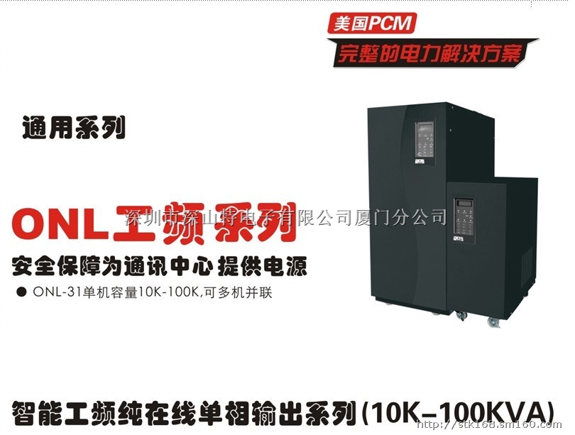 深圳市深山特电子有限公司厦门分公司是美国PCMUPS总代理,专业负责福建地区厦门、福州、泉州、漳州、三明、宁德PCM产品的销售,产品包括PCMUPS电源、PCM电池、PCM稳压器等产品。美国PCMONL33三相工频系列ONL-10K33 ONL-15K33 ONL-22.5K33 ONL-30K33 ONL-45K33 ONL-60K33 ONL-80K33 ONL-100K33 ONL-120K33 ONL-160K33 ONL-200K33 ONL-250K33 ONL-300K33 ONL-400K33 ONL-500K33 ONL-600K33 ONL-800K33。深圳市深山特电子有限公司厦门分公司福建代理销售厦门工业级UPS工频UPS 内置隔离变压器,可带SMT贴片机印刷机 检测仪器,专业用于生产设备,各种生产线,工业设备,工厂设备,电子厂,三星贴片机,西门子贴片机,松下贴片机,富士贴片机,三洋贴片机,松下贴片机 富士贴片机 三洋贴片机 西门子贴片机 环球贴片机 索尼贴片机 雅马哈贴片机 飞利浦贴片机 JUKI贴片机全自动贴片机,回流焊机,高精密丝印机自动光学检测仪欧姆龙AOI光学检查机等设备