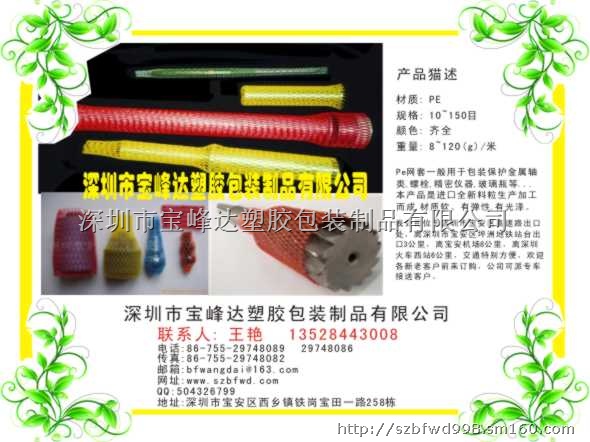 深圳市宝峰达塑胶包装制品有限公司,专业生产各种挤出塑料网套,一般原材料为:PE / EVA / PP,用于包装保护金属轴类、螺栓、精密仪器、玻璃器具等…保护外表面保护表层及边缘部分,在运输,搬运,以及储存时不会受到损伤,防止损伤外表面。主要特性有:材质软,易储存,可再利用及再循环,经济环保。适合套直径5mm-直径500mm的各种物品,从每周10个孔起,每周增加5-10网孔为一规格,目前最多一周有280个网孔,网套的每米克重、网孔的大小、都可以在生产时按要求调整。可以以任何形状来配合部件或产品的包装须要,产品种类多,规格齐全,配色精美,免费打样,产品横向收缩性好,也可按客户要求生产,开发出各行业所须的防伪产品。 我公司位于深圳市宝安区高速路出口处,离深圳市宝安区坪洲地铁站台出口3公里,离宝安机场8公里,离深圳火车西站6公里,交通特别方便,欢迎各新老客户前来订购,可派专车接送客户