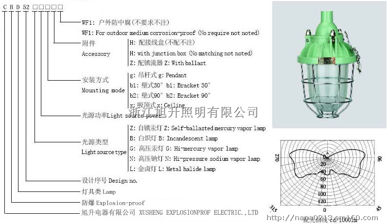 1区,2区危险场所。 Can be used in Zone 1and Zon 2 dangerous places. ⅡA,ⅡB类爆炸性气体环境。 Can be used in IIA、IIB、 group explosive atmosphere. 可配装白炽灯、汞灯、高压钠灯、金卤灯。 Suitable for incandescent lamp,mercury vapor lamp, 注:可按用户要求配装灯伞。 high-pressure sodium vapor lamp,metal halide lamp. Notice:Can be install lamp cover according to user's requitemnt.