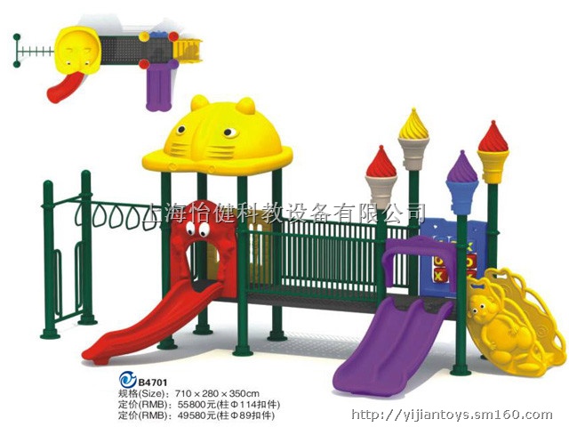 大型组合滑梯,小博士组合滑梯,滑梯秋千组合-上海怡健游乐www.henanqinglian.cn上海怡健游乐生产的户外组合滑梯产品以“主题”为表现形式,其设计巧妙、色彩和谐,根据小朋友的兴趣及爱好精心设计各种不同样式。全套产品各个部件的巧妙结合,所有连接全部用自主设计的安全扣件连接。表面没有任何尖锐物凸出.每个部件均有多个型号和多种颜色选择,可给孩子带来安全,欢乐和活泼的感受,是一座新型、综合性很强的儿童乐园。针对儿童喜欢钻、爬、滑等特点,整套设施包括门、桥、滑筒、屋顶、楼梯、平台、立柱、爬梯、滑梯、攀爬架和绳网等。产品色彩鲜艳,娱乐性强,功能齐全,质量可靠。同时可以根据客户的需要进行个性化设计、生产。组合滑梯系列产品独特而千变万化的游戏设计,令建造游乐场、幼儿园、社区等场所能够在有限的空间里营造出无限的欢乐和吸引力。上海怡健游乐