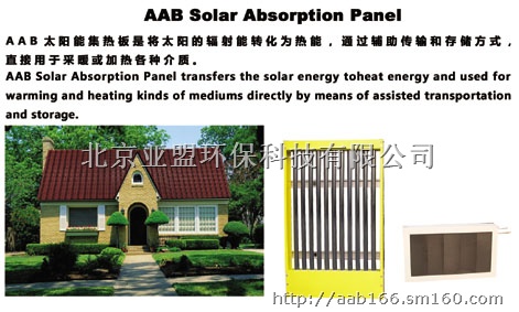 AAB太阳能集热板是一种将特殊材料表面通过高科技手段处理后的具有对太阳能辐射吸收最佳结构的太阳能吸收器,同时通过储热装置,还可以将太阳发出的热能储存起来。吸热及储能材料是一种无毒、无害、无燃、无辐射、无污染、结构稳定、安全可靠的物质,转换效率高达80%以上。将热能通过热交换系统迅速传到人们所需要的地方。